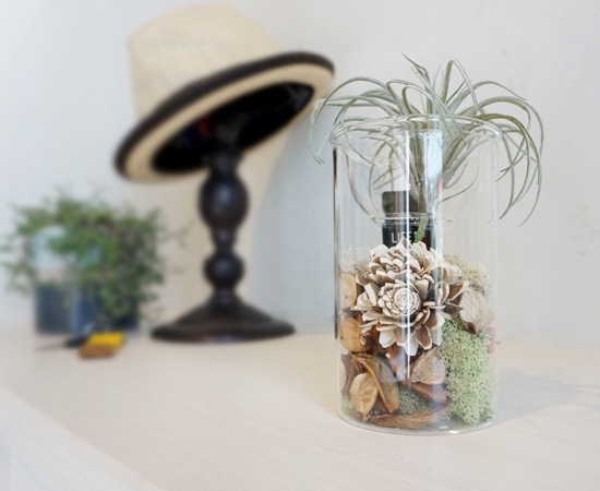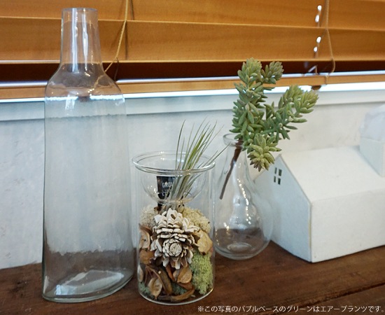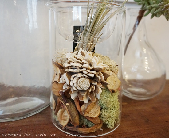 ガラス瓶の中にポプリとウッドチップなどを詰め込んだバブルベースに、水やりが少なくてOKなエアープランツをセットにしたアイテム。玄関先やキッチン、棚などに置けば空間にアクセントを付ける事ができます。ガラス瓶の中にある木の皮から作られたソラフラワーに、お好きなアロマオイルを垂らして楽しむ事もできます。
