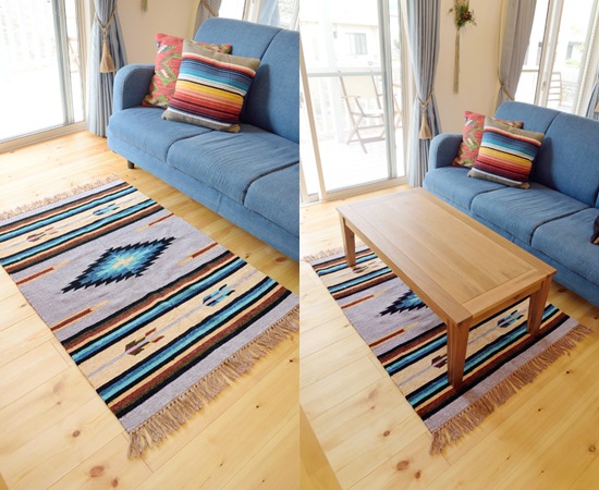 今回は、そんなラグの中から、ブルーのカラーと、中心の菱形が印象的なキリムラグDをご紹介いたします。このラグは、A~Dタイプまでの4種類が用意されているので、柄やカラー等をスタイルに合わせて選ぶことが可能です。