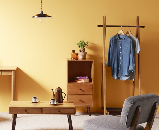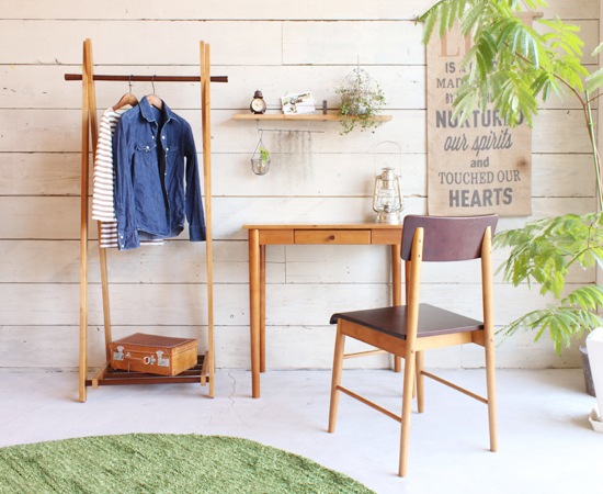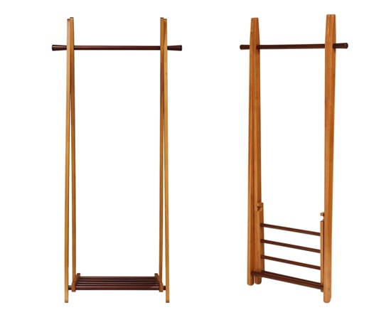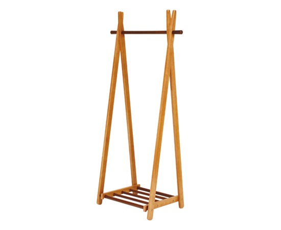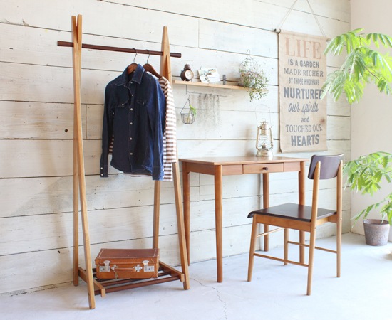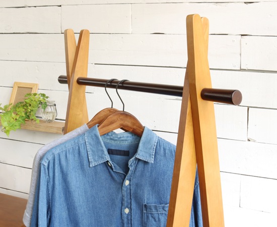 フレームや棚部分に使われているのは天然木のラバーウッド材。表面にはブラウン系の塗装も施していて、落ち着いた雰囲気に仕上げています。ハンガー部分や棚部分にも同じ素材が使われているのですが、ここは、フレームよりも濃い色に塗装されていて、それがアクセントにもなっています。下の棚部分は、持ち上げる事でハンガーラックを折りたたむことが可能になります。