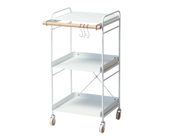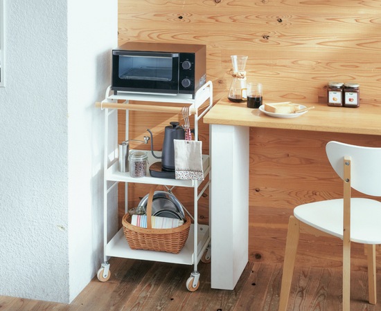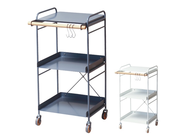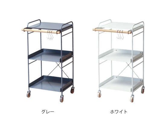 収納ワゴンには、丈夫な素材としてテーブルや椅子などの家具に多く使われているスチール素材を採用しています。フレームに使われているスチールもそれほど太くはなく、圧迫感も軽減できます。棚板にもスチール素材が使われていて、レンジなどの調理家電を置くのにもピッタリです。収納ワゴンの前面には、天然木のビーチ材を採用。ワゴンのアクセントにもなっていますし、付属のS字フックを使えば、小物などを掛ける事も可能です。カラーはグレーとホワイトの2色が用意されています。