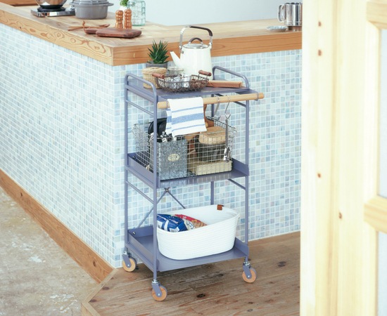 調味料や調理家電など、キッチンにはたくさんの「物」がありますよね。それらを整理整頓するためには収納家具が重要となりますが、これも大きな物から、小さなものまで多くのデザインやサイズがあります。ご紹介するのは、金属素材のワゴンに、天然木の取手がアクセントとなっている収納ワゴンをご紹介いたします。