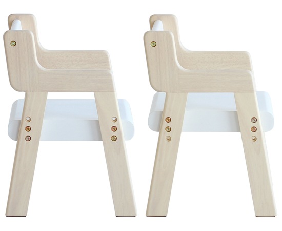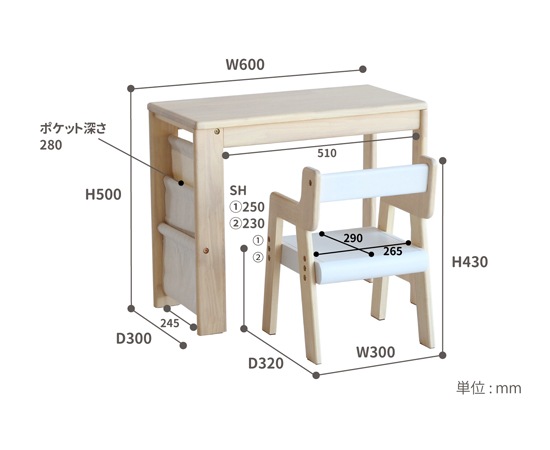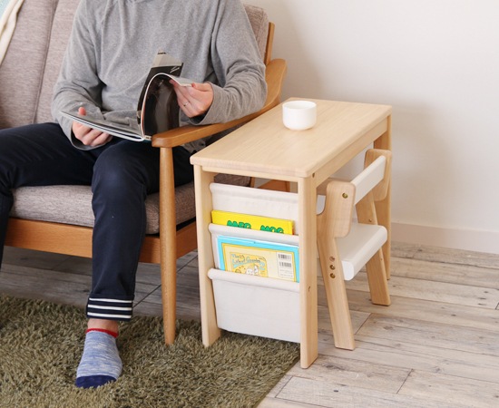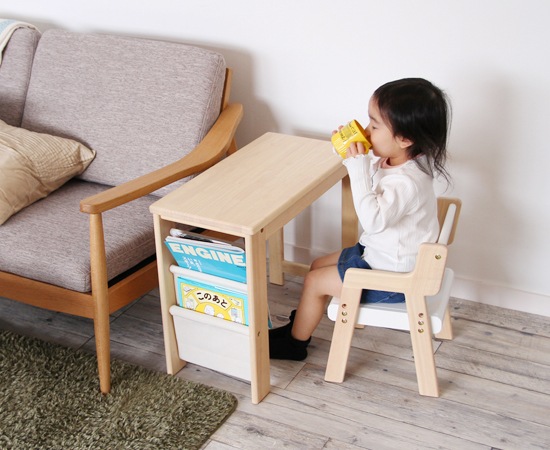 デスクのサイズは、幅600×奥行300×H500(mm)、椅子のサイズは、幅300×奥行320×高さ430×座面高230/250(mm)となっています。椅子は2段階で高さ調節できるので、成長に合わせてお使いいただけます。デスクの高さは、ソファの隣に置いた時にも丁度よく、ソファに座りながらお子様の遊びを見守る事もできます。子供が成長して使わなくなっても、サイドテーブルとして使う事もできますよ。