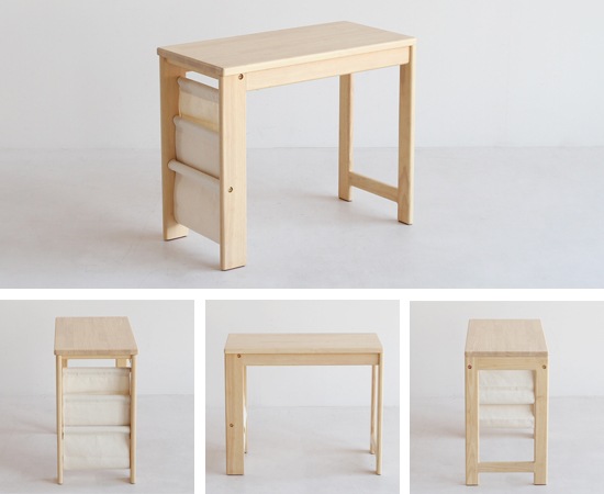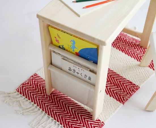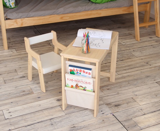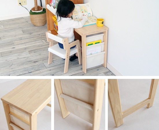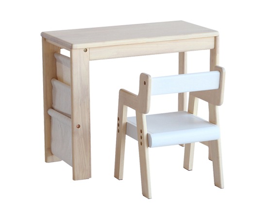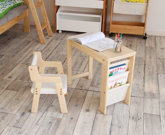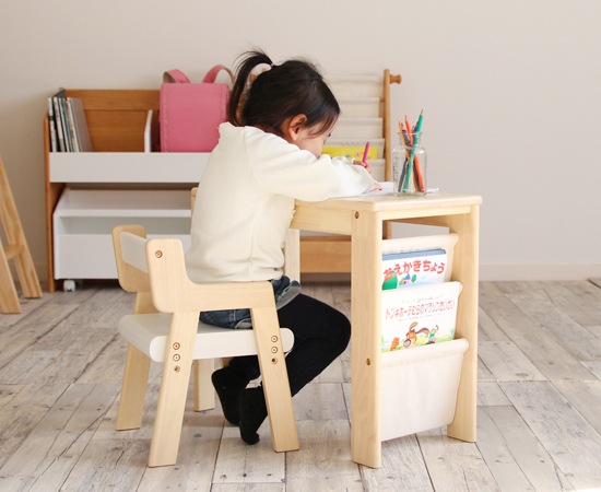 デスクの天板や脚に使われているのは、天然木のラバーウッド材。木目や木の温もりを感じられる仕上げは、小さなお子様にもおすすめです。デスク横には帆布を使ったラックを用意。お気に入りの絵本などを入れておけば、自分で取り出して見る事もできますよね。セットの椅子のフレームには、天然木のラバーウッド材を採用。肘が付いていますから、横から転がり落ちる心配も有りません。座面には繊維板が使われていますが、デスクとのバランスも考えられたデザインになっています。