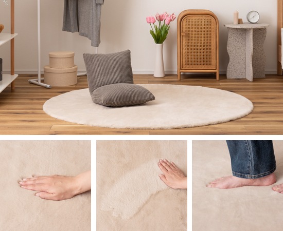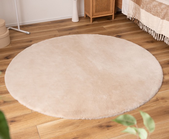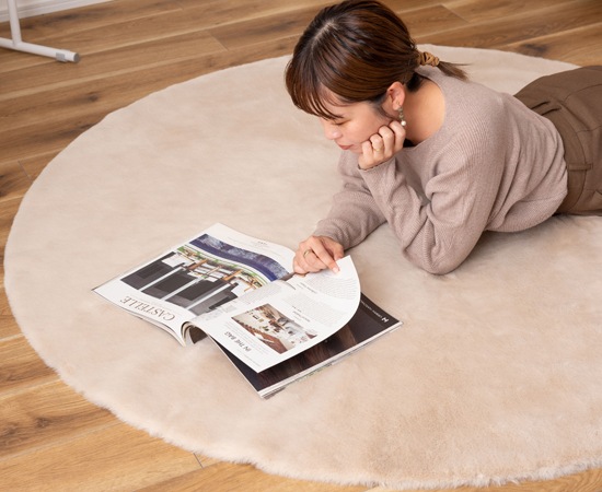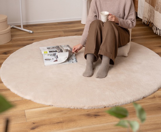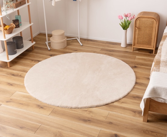 ラグのサイズは、直径1500mm。1人暮らしの方はもちろん、お子様が遊ぶ場所に敷きたいという方や、リビングで使いたいという方にもおすすめです。ふわふわの手触りで、少し贅沢な空間づくりをするのも良いですね。