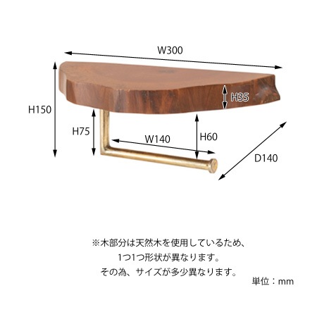 ペーパーホルダーのサイズは、約幅300×奥行140×高さ150(mm)となっています。天然木の表情を活かした仕上げですから、微妙にサイズや表情が異なるのも魅力。自分だけのペーパーホルダーとしておしゃれを楽しんでください。もちろん、ペーパーホルダー以外にもタオル掛けやキーホルダーとして使うのも良いですね。壁面への取り付け用にネジも付属されていますよ。