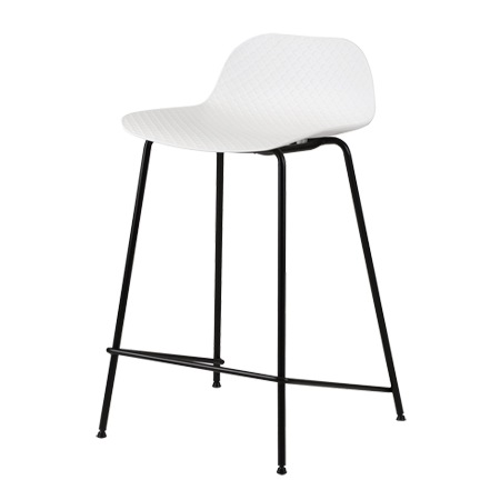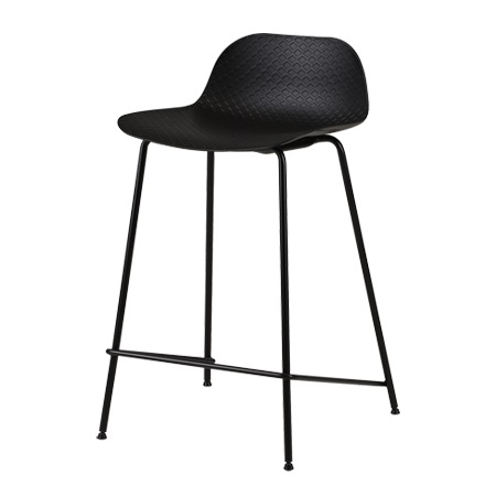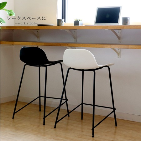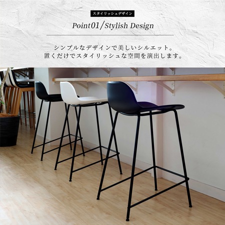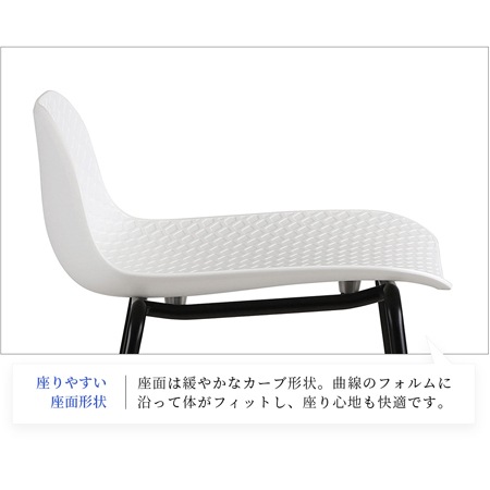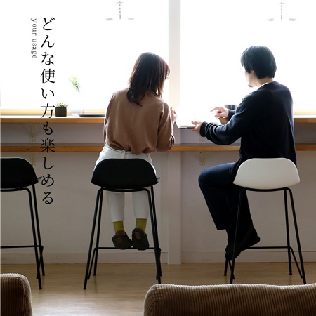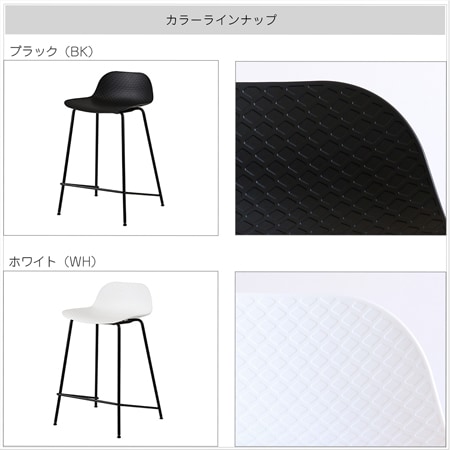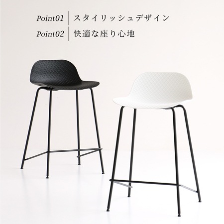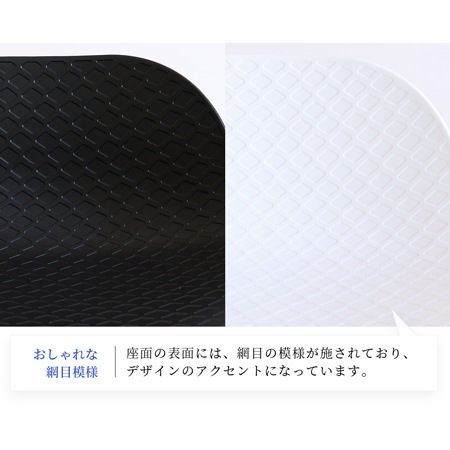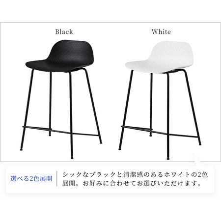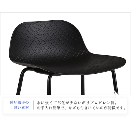 バースツールの座面には、ポリプロピレン素材を採用しています。座面の表面には、網目の模様が施されており、デザインのアクセントにもなっています。ポリプロピレンは、水にも強く劣化が少ない素材で、傷もつきにくく、お手入れも簡単です。カラーはブラックとホワイトの2色を用意。色を統一するのも良いですし、ホワイトとブラックを混ぜて使うのもおしゃれですよね。脚には粉体塗装を施したスチール素材を使っています。