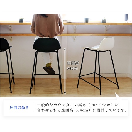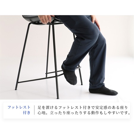 バースツールのサイズは、幅460×奥行480×高さ815×座面高640(mm)となっています。一般的なハイカウンターの高さは900~950mm程度と言われていて、それに合わせられる座面高に設計されています。座面も緩やかなカーブが付けられていて、座り心地も抜群ですよ。フットレストも付いていますから、立ったり座ったりする動作もしやすいです。
