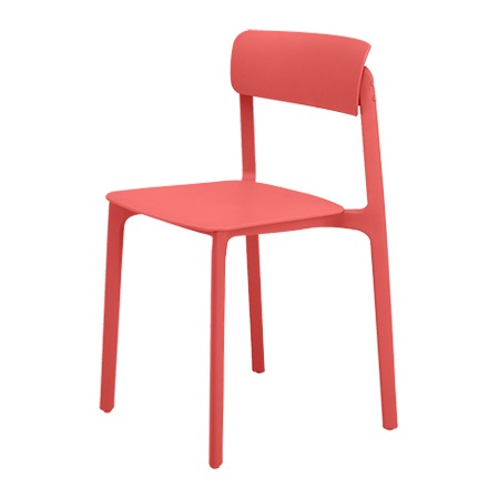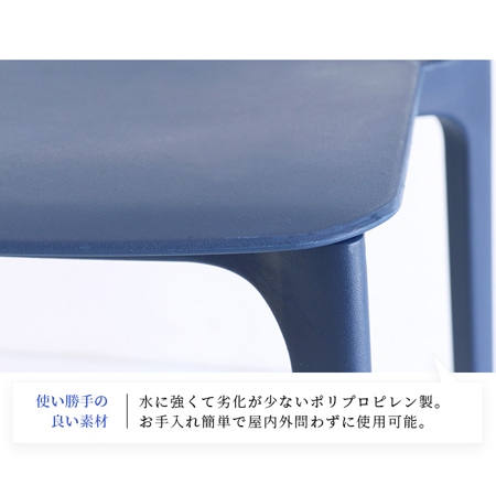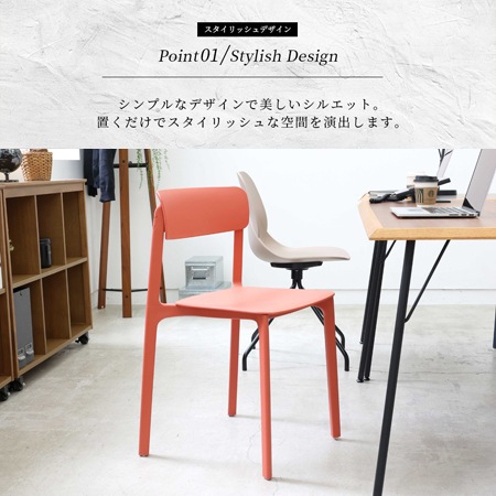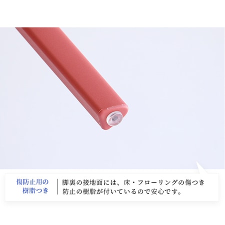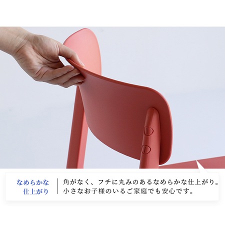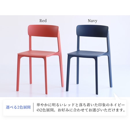 椅子には、傷や汚れにも強いポリプロピレンを採用しています。水にも強く劣化が少ないポリプロピレンは、加工も容易で、この椅子のような一体成型される家具にもよく使われています。背もたれや座面は角が無く、フチに丸みのある滑らかな仕上がりになっています。小さなお子様のいるご家庭でも安心ですね。椅子のカラーは、華やかに明るいレッドと落ち着いた印象のネイビーを採用。お好みに合わせてお選びください。脚先には傷防止用の樹脂素材も付いています。