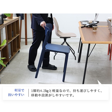 椅子のサイズは、幅500×奥行470×高さ800×座面高465(mm)となっています。幅広のサイズですから、座っていても安定感がありますよ。椅子は積み上げる(スタッキング)も可能ですから、使わない時には省スペースにまとめる事もできます。お掃除の時には助かりますね。オフィスのミーティングスペース等では、スタッキングができれば、スペースを広く使う事もできます。