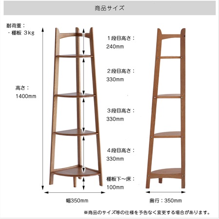 コーナーラックのサイズは、幅350×奥行350×高さ1400(mm)となっています。シンプルな中にもこだわりをたくさん詰め込んだデザインで、桟をアーチ状にし、棚板にはエッジ処理を施す事でアクセントにしています。フレームの上部は、バッグや小物などを引っ掛ける事もできますよ。