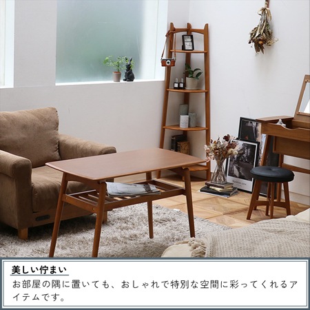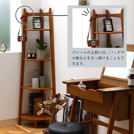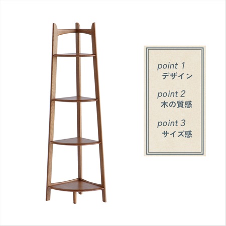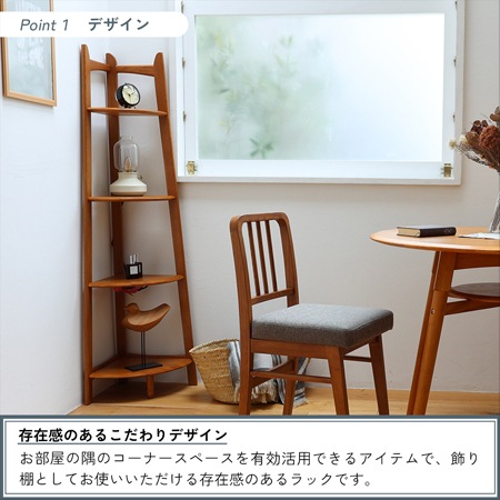 コーナーラックには天然木化粧板や天然木を採用しています。ブラウン系の塗装を施していて、レトロ感があり、ちょっとした非日常感を味わえる仕上げになっています。お部屋の隅のコーナースペースを有効活用できるデザインは、飾り棚としてお使いいただけます。自宅だけでなく、店舗でも使えるおしゃれラックですよ。