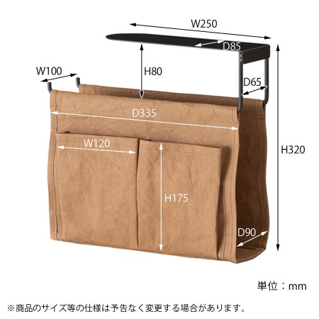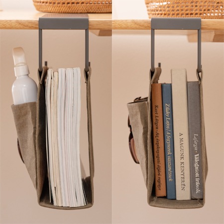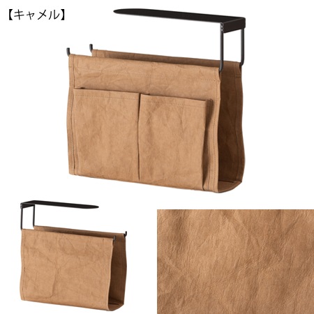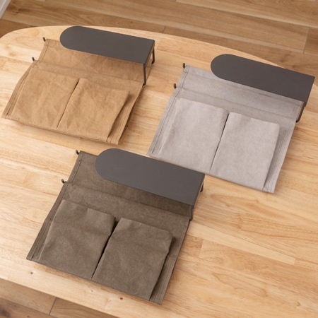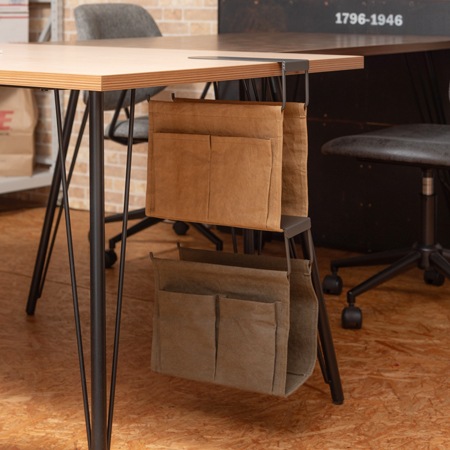 収納バッグの張地には、強化ベラム紙を使っています。ベラム紙は、きめが細かく滑らかな肌触りが特徴ですが、あえてシワを付けた加工を施す事で、使用感をプラスしています。もちろん、破れないように強化加工が施されているので安心してお使いいただけます。フレームにはスチール素材を採用。テーブルに掛けて上げる事で、テーブルの下に収納を設ける事ができます。カラーは、キャメル、グリーン、グレーの3色が用意されています。