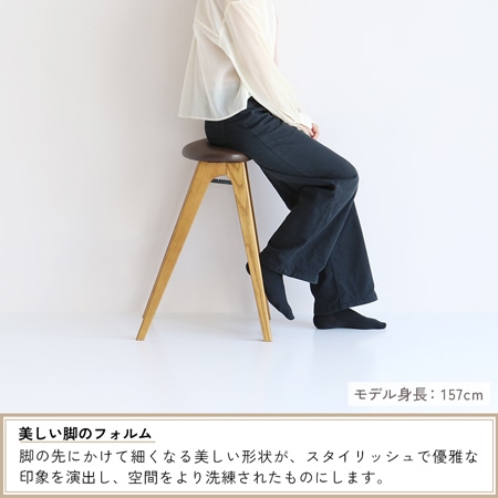 ハイスツールのフレーム部分には、天然木のアッシュ材を採用しています。木目が美しく、個性的な模様が存在感を放ち、天然木の風合いを楽しむ事ができます。フットレストも設けられていますが、丸みを帯びた加工が施されていて、優しい雰囲気をプラスしています。座面の張地は、合成皮革とコーデュロイ生地の2種類を用意。合成皮革はブラウン系のカラーで弾力があります。コーデュロイはカーキ系のカラーで、ふかふかした座り心地の印象です。