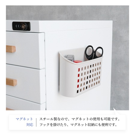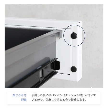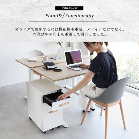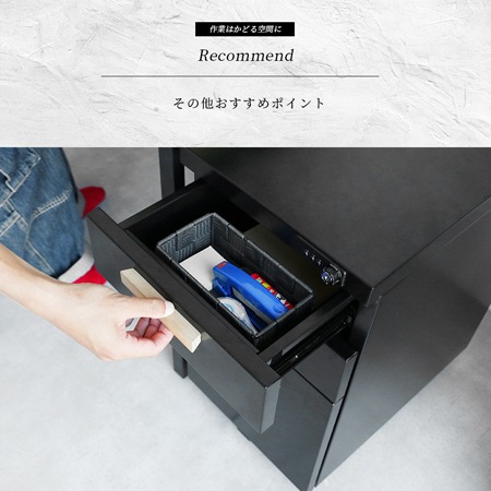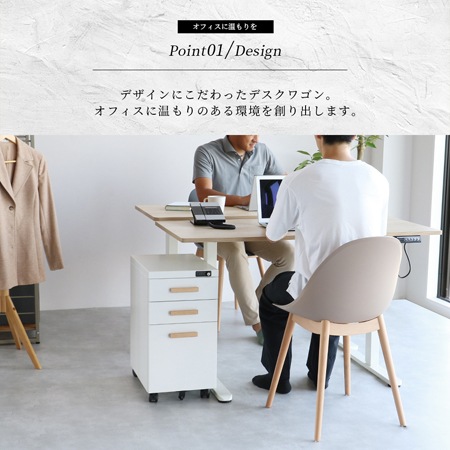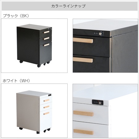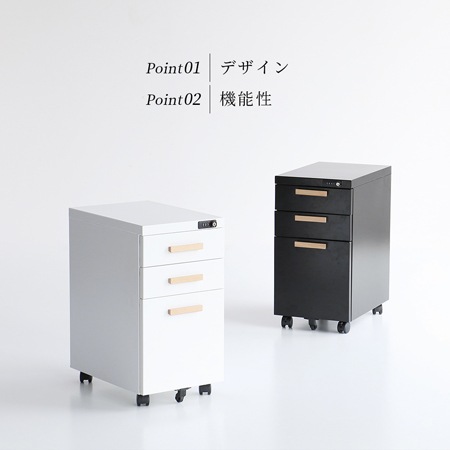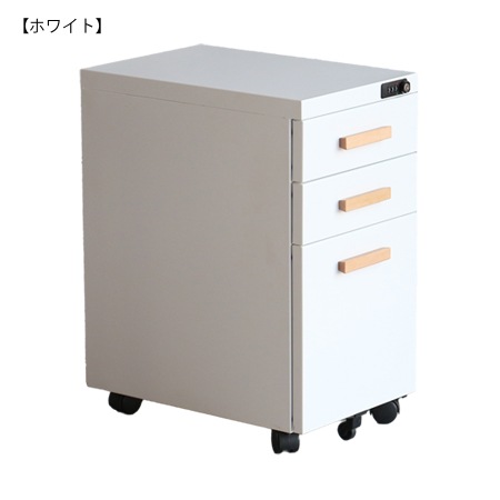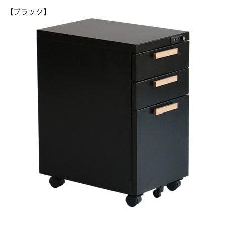 デスクワゴンの本体にはスチール素材を採用。粉体塗装を施す事で落ち着きのある雰囲気に仕上げています。カラーはブラックとホワイトの2色を用意。引き出し部分に天然木を使った取手を使用する事で優しい印象を与えています。引き出しには、セキュリティにも配慮したロック機能を搭載。1つの施錠ですべての引き出しにロックを掛けられます。ダイヤル錠でしっかり情報を守る事ができますよ。