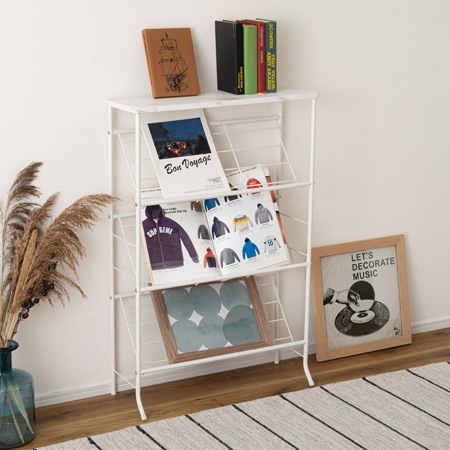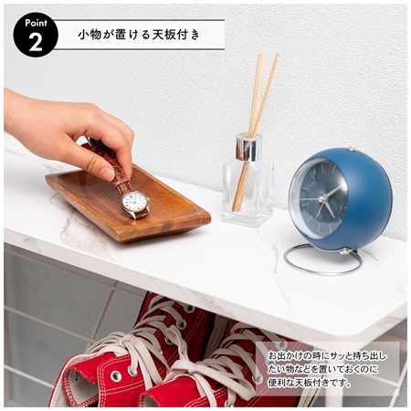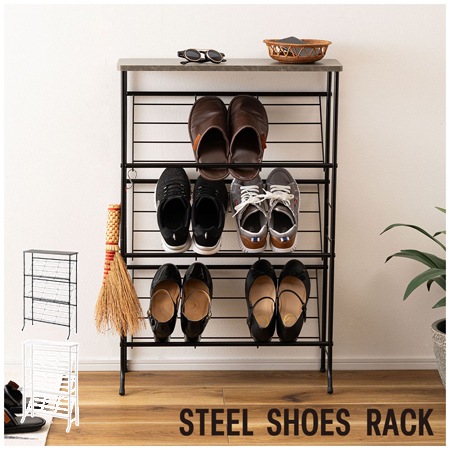 このシューズラックのフレームには、スチール素材を採用しています。スチールには、錆や紫外線にも強い粉体塗装を施しているので、お手入れも簡単です。天板には繊維板に石目柄の化粧板を貼り合わせたものを採用しています。フラットなデザインですから、小物置きやインテリアのディスプレイとしても活用できます。お出かけ時に必要な玄関の鍵や車の鍵などを置くのも良いですね。カラーはブラックとホワイトの2色が用意されています。