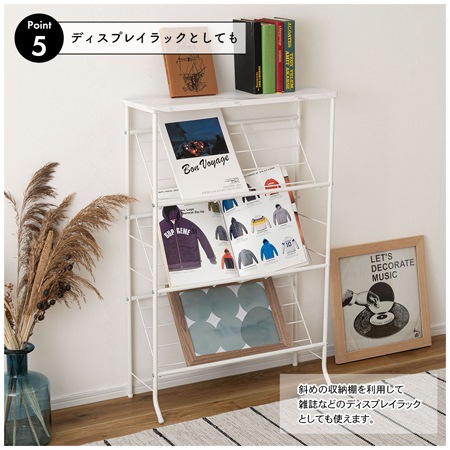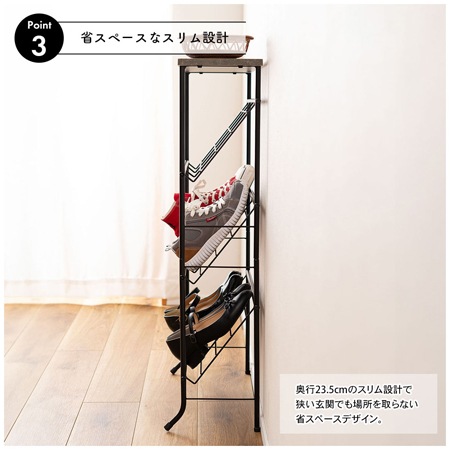 シューズラックのサイズは、幅600×奥行235×高さ895(mm)となっています。奥行235mmのスリム設計で狭い玄関でも場所を取らない省スペースデザインになっています。靴は9足程度を収納可能。収納棚が斜めになっているので、ハイカットの靴も入れやすく、サッと取り出しやすい設計です。匂いや湿気がこもらない通気性の良いオープンタイプですから、扉を開ける手間もなく、すぐに靴を取り出す事ができますよ。斜め収納を利用して雑誌などのディスプレイラックとして使うのも有りですね。