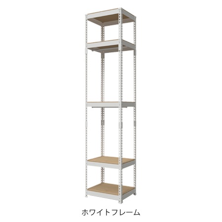 シェルフの素材には、椅子やテーブルなど、多くの家具に使われているスチール素材を採用しています。一般的なシェルフはボルトを使って組み立てる構造が多いですが、この収納シェルフはボルトを使わないボルトレス設計になっているので、組み立てもとっても簡単です。ボルトを使わない設計であっても耐荷重はしっかりと確保していて、ハンガーバーは20kg、棚は50kgを確保しています。