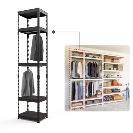 ハンガーバーが2本付いたスリムな収納シェルフ5段。