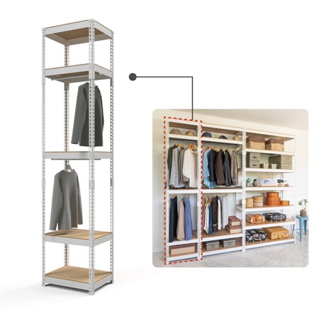 くらしをする中で家の中の収納は重要ですよね。物の整理整頓はもちろんですが、洋服の収納や書類の収納、日々増えていく本の収納など、いろいろな収納家具があると思います。大きなウォークインクローゼットを備えている方も、中には棚を置いている方もいらっしゃるのではないでしょうか。ご紹介するのは、洋服を掛けるハンガーバーを2本搭載した収納シェルフです。(※ハンガーバーは取り付けの向きにご注意ください。)
