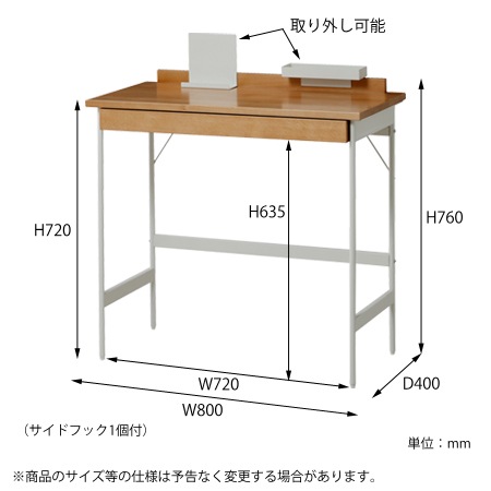 デスクのサイズは、幅800×奥行400×高さ760(mm)となっています。デスクの横に取り付ける事ができるフックを1つ付属していて、左右の各3ヶ所にある取り付け位置に付け替える事ができます。奥行も40cm程度と、リビングやダイニングにも置く事ができるサイズですから、お子様のダイニング学習にも役立ちますよ。