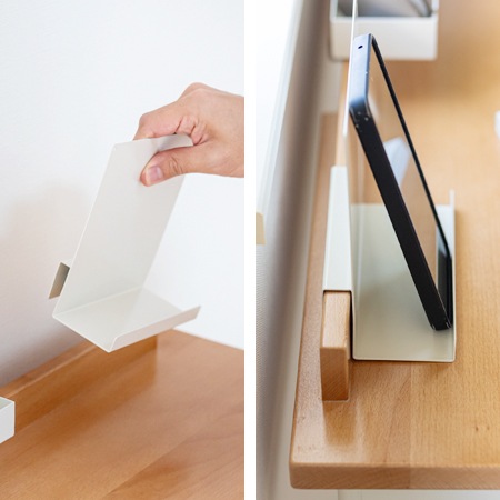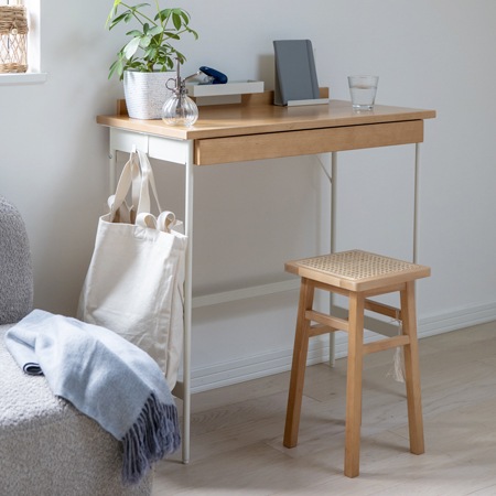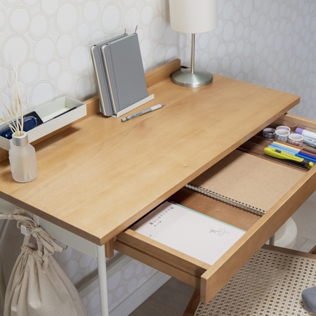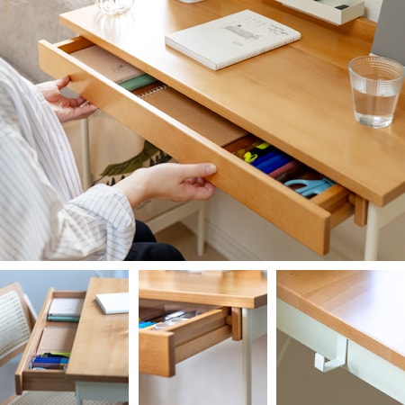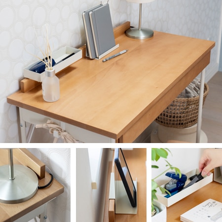 デスクの天板には、天然木のビーチ材を採用しています。引き出しが付いているので、書類や小物の収納もできます。天板には、貫が取り付けられていて、そこに付属のトレイとスタンドを取り付ける事ができます。スタンドにはスマホやタブレットを立てる事ができますし、トレイには文房具や小物を収納する事も可能です。スタンドとトレイは取り外しが可能ですから、自分の好きな位置に付け替えることも簡単ですよ。