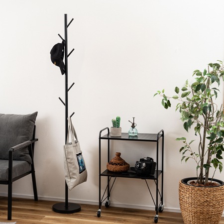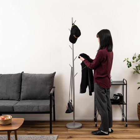 上着を掛けたり、帽子を掛けたりなど、いろいろな物の収納としての役割も果たす事ができるポールハンガー。玄関やリビングに配置して使う事も多く、上着やバッグを掛けておけば、お出かけ前にすぐに手に取る事ができるのでとても便利ですよね。もちろん、玄関だけでなく、リビングやプライベートルームに置くのも良いですし、オフィスや店舗で使うのも有りですね。ご紹介するのは、木を思わせるデザインのポールハンガーです。