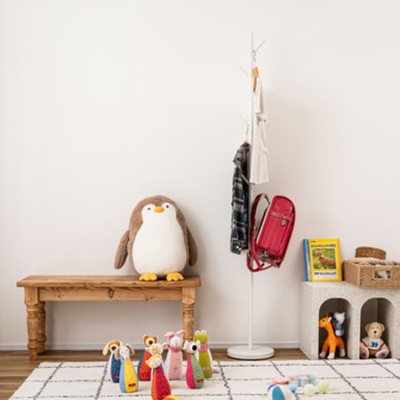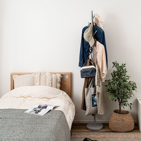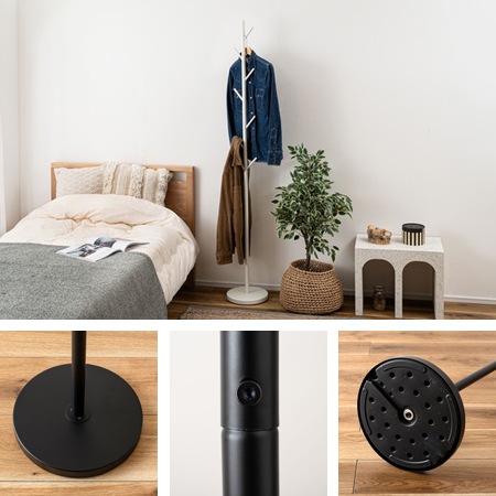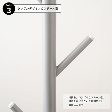 ポールハンガーの素材には、椅子やテーブル、収納棚にも使われるスチール素材を採用しています。丈夫で安定感のある素材で、粉体塗装を施す事でマットな落ち着きのある雰囲気に仕上げられています。カラーは、ブラック、グレー、ホワイトの3色が用意されています。グレーの先端は白色になっているのもポイントですよ。