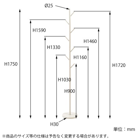 ポールハンガーのサイズは、幅260×奥行260×高さ1750(mm)となっています。一番下の枝部分の高さは900mm、一番上の枝部分の高さは1720mmとなっています。幅と奥行がコンパクトにまとまっていて、スッキリとしたデザインは、幅広いインテリアスタイルにお薦めです。合計で7本のフックは斜めに取り付けられているので、物を掛けた時にずり落ちにくい構造になっています。