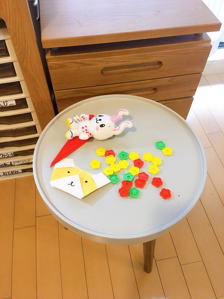 こどものおもちゃやボールペンなども転がりおちません!これってサイドテーブルではお盆のようでレアですよね!