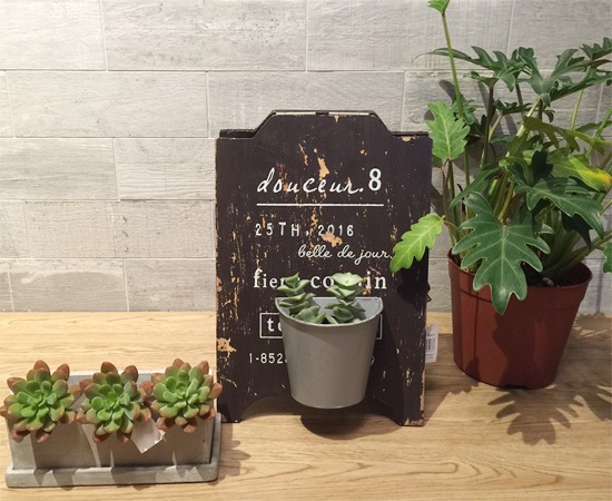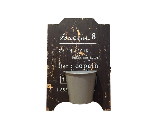 今回は、たくさんある魅力的な小物の中からサインポットパネルをご提案いたします。このアイテムは、小さめの看板にポットを取り付けたもの。看板には文字が書かれており、さらに使い古されたような加工が施されています。その上に、ポットを取り付け、グリーンなどを入れることができるようになっています。(※ポットには穴があります。)