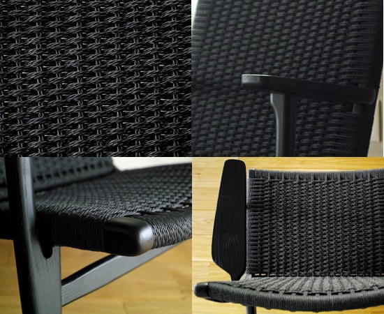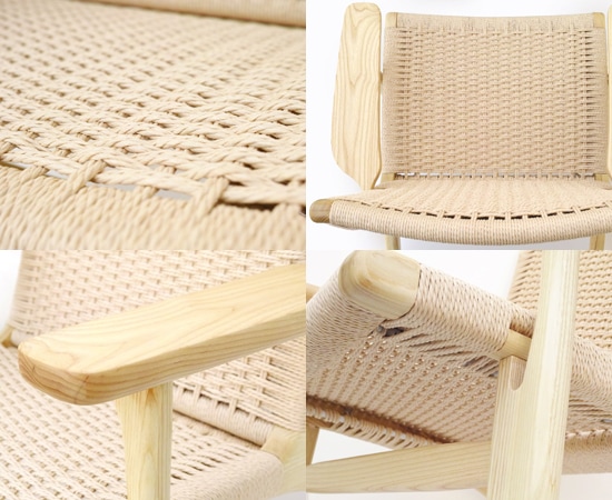 ラウンジチェアの編み座は、全て熟練した職人の手作業によって綺麗に編み込まれています。長さ400m以上にもなるペーパーコード(麻紐)をこのように均一に編むには、膨大な手間と高い技術が必要とされます。ペーパーコードには適度なクッション性があり、使うほどに体になじんできます。湿気がこもらないので夏でもさらりと涼しく、冷たくならないので冬でもあたたかです。ペーパーコードを使う事により、オールシーズン快適に使える、とても機能的なラウンジチェアとなっています。