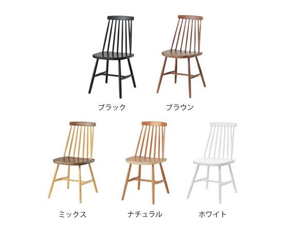 用意されているカラーは、ブラック、ブラウン、ミックス、ナチュラル、ホワイトの5色。ブラウンとナチュラルは、木そのものの色合いを活かした物で、経年変化も味わう事が出来ます。ブラックとホワイトは、ツヤを抑えた塗装になっていて、ナチュラルテイストからスチール脚のハードテイストまで幅広く合わせる事が出来ます。ミックスは、座面と背もたれの一部にブラウンを使い、その他はナチュラルのカラーを使っています。