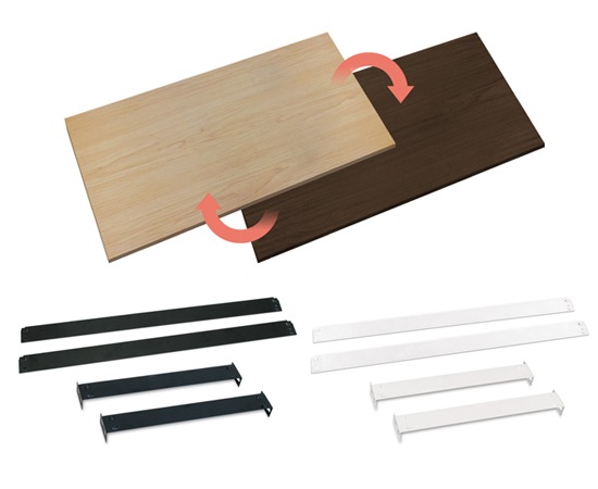 使われているMDFのボードは、表と裏で色が異なり、リバーシブル仕様となっています。机として使う場合も、ナチュラルとブラウンのカラーが選べるのはうれしいですよね。ボードに取り付けるスチールの枠も、取り付け方を工夫すれば、サイドバーを設ける事が出来るので、物が転がって下に落ちてしまう事を防止する構造にする事も可能です。フレームのカラーはブラックとホワイトの2種類が用意されています。