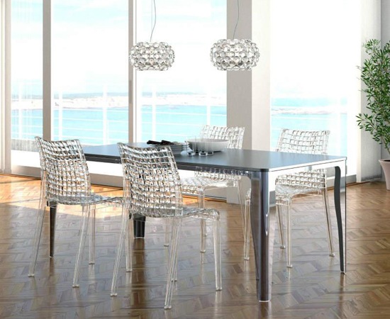 椅子のサイズは、W430mm×D510mm×H850mm(SH460mm)。ダイニングはもちろん、カフェなどの店舗での客席用の椅子としても使えるサイズだと思います。また、4脚程度までであればスタッキングも可能なので、掃除なども効率的に行うことが可能です。カラーは、クリスタル、スモークの透明色2色と、グロッシーホワイト、グロッシーブラック、カルテルレッドのオペック色(不透明)3色の計5色が用意されています。