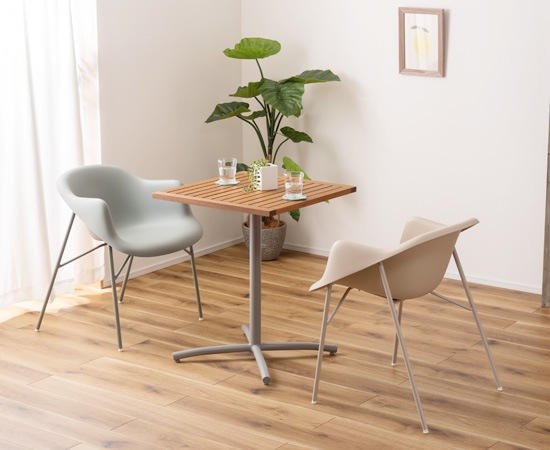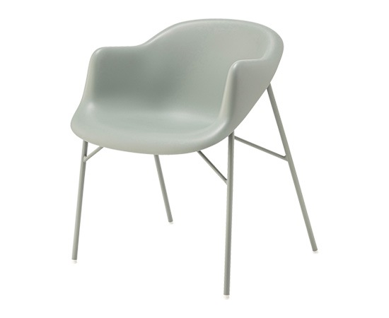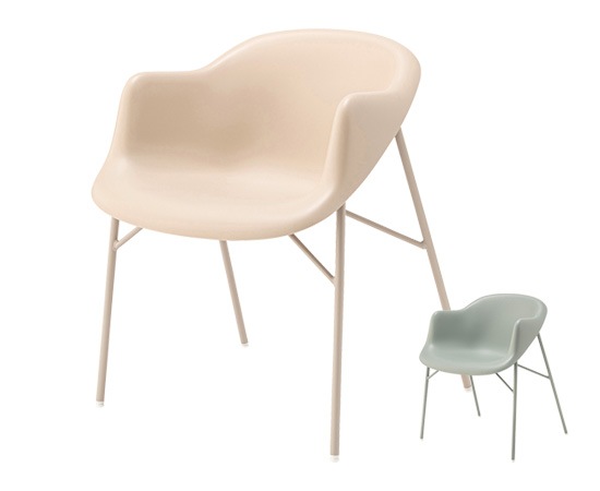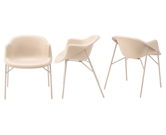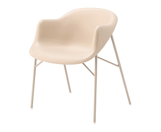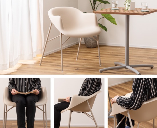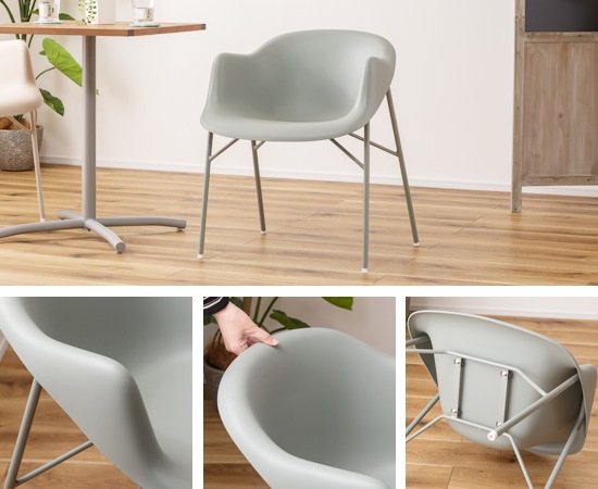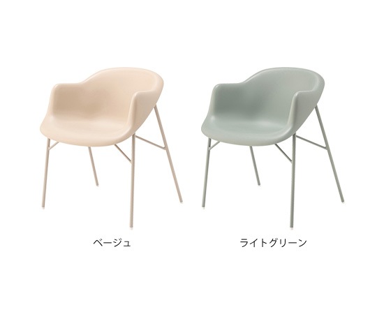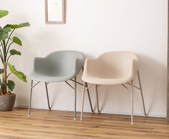 椅子の座面や背もたれ部分は、ポリプロピレン素材を使って一体成型されています。肘掛け部分も付けられているデザインで、ちょっと個性的ですよね。カラーは、ベージュとライトグリーンの2色が用意されています。脚部には、スチール素材に、マットな表情に仕上げる事ができる粉体塗装を施しています。座面と同じ色で仕上げられていますから、統一感もありますよ。