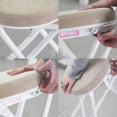 折りたたみ椅子のフレームには、ホワイト系の塗装が施されたスチール素材を採用しています。ホワイト系のカラーは清潔感も有りますし、おしゃれで可愛い雰囲気もありますから、他の家具とのコーディネートも楽しめますね。脚先には、座面カラーと同じ色のキャップがはめられているのもポイントですよ。座面と背もたれにはポリエステル素材を採用。厚みのあるクッションは、底付き感が無く、長時間の使用にもおすすめです。
