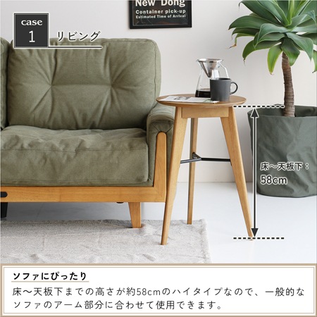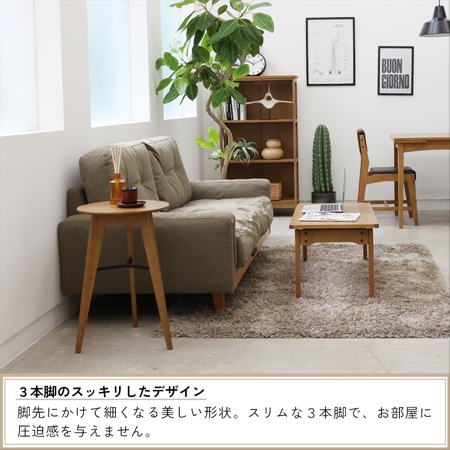 サイドテーブルのサイズは、幅400×奥行425×高さ590(mm)となっています。3本脚のスッキリとしたデザインと、脚先にかけて細くなる形状は、お部屋に圧迫感を与えません。天板のエッジ部分も斜めにカットされているので、軽やかな印象になっています。ソファ横やベッド横、玄関等、幅広いシーンでお使いいただける机です。